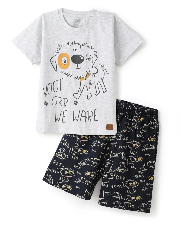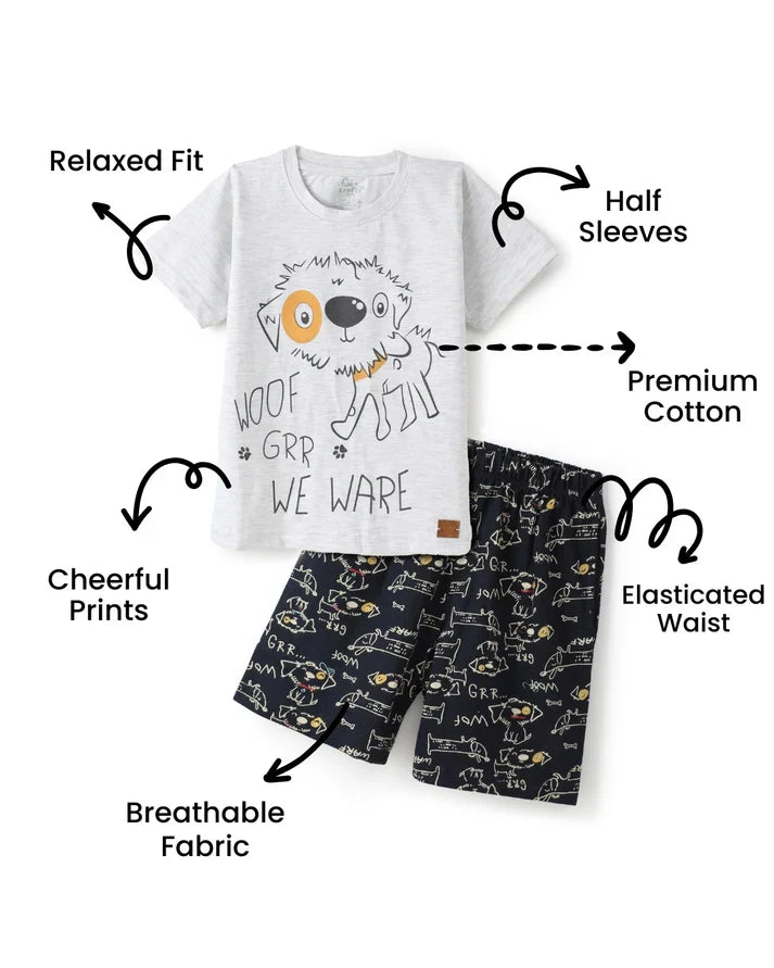 Navy Blue & Grey Puppy Printed Premium Cotton T-Shirt & Shorts Set for Boys & Girls